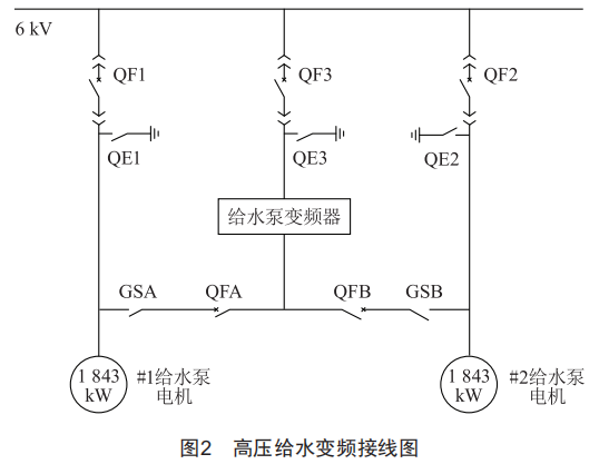 原設(shè)計高中壓給水泵一運一備,兩臺高中壓給水泵電機分別由兩臺6kV開關(guān)供電。變頻改造采用"一拖二加旁路"方式,即一臺變頻器可分別拖動兩臺給水泵,設(shè)置一臺6kV開關(guān)單獨給高壓給水變頻器供電,變頻器輸出端分兩路分別引至高壓給水泵電源開關(guān)出線處,變頻接線如圖2所示。