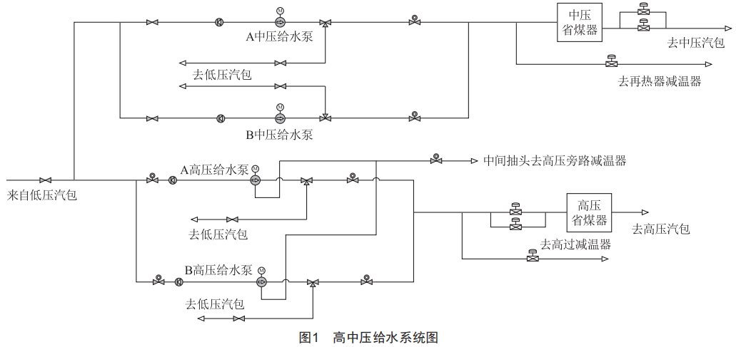 高中壓給水系統(tǒng)的主要作用是為高中壓汽包補水,同時也為高壓過熱器、再熱器及高壓旁路減溫器提供減溫水。節(jié)能改造前,高壓給水及高過減溫水取自高中壓給水泵出口,中壓給水、再熱器減溫水及高旁減溫水取自高中壓給水泵中間抽頭。高壓給水泵變頻改造后,考慮低頻運行時無法同時滿足高中壓給水需求,故新增一套中壓給水系統(tǒng),中壓給水及再熱器減溫水改由中壓給水泵供水,高旁減溫水仍取自高中壓給水泵中間抽頭。系統(tǒng)流程如圖1所示。