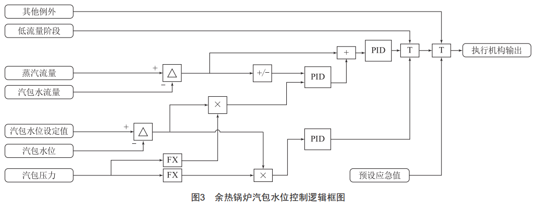 高中壓汽包水位控制采用的是汽包水位、蒸汽流量和給水流量組成的三沖量調(diào)節(jié),根據(jù)蒸汽流量高低分別采用單沖量調(diào)節(jié)和三沖量調(diào)節(jié)[3]??刂坪诵氖侨齻€比例積分器,單沖量調(diào)節(jié)單獨采用一個比例積分器,三沖量調(diào)節(jié)采用兩個比例積分器,單沖量調(diào)節(jié)時比例積分輸入為汽包水位偏差,三沖量調(diào)節(jié)則疊加了蒸汽流量與給水流量差值作為比例積分器輸入,控制輸出值即作為執(zhí)行機構(gòu)輸出??刂七壿嬁驁D如圖3所示。