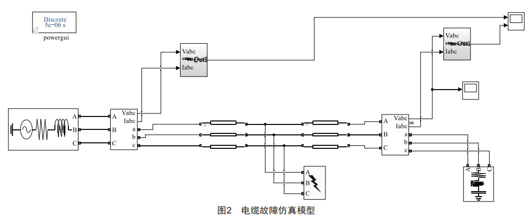 運用Matlab仿真軟件搭建電纜故障仿真模型,并對其進行分析,搭建的電纜故障仿真模型如圖2所示。