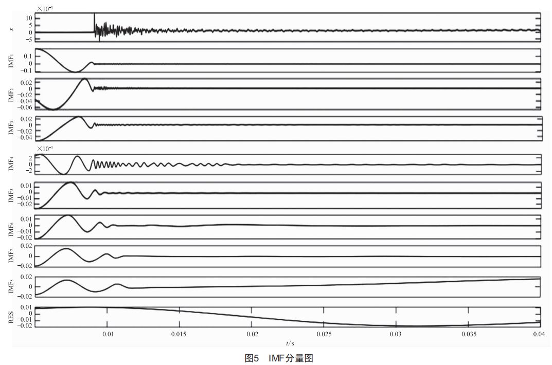 (4)得到的新的本征模態(tài)函數(shù)若滿足式(9),即模態(tài)混疊現(xiàn)象消除。若不滿足式(9),則式(10)中的i加1,重新添加進原信號進行分解,重復(fù)步驟直到消除模態(tài)混疊現(xiàn)象。