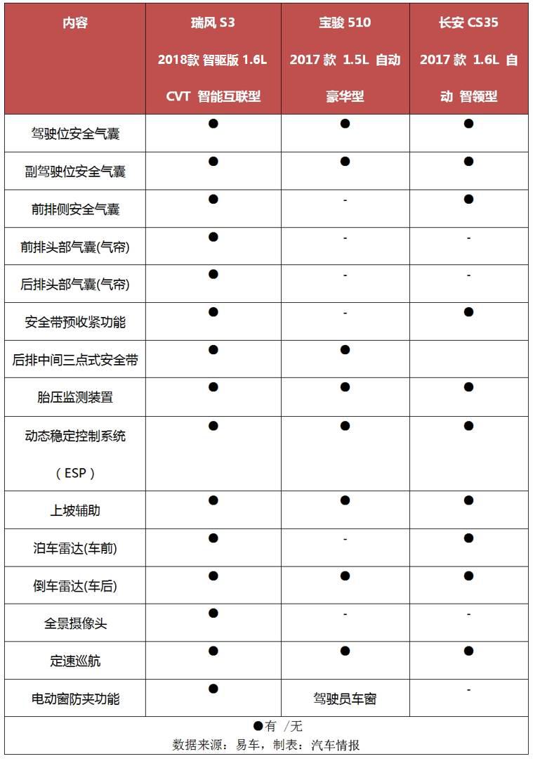 與智能化配置環(huán)節(jié)出現(xiàn)的一邊倒不同,在安全配置方面,三者的用心程度都值得點(diǎn)一個大大的贊。從基礎(chǔ)的主副駕駛安全氣囊、胎壓監(jiān)測、車身穩(wěn)定系統(tǒng)、上坡輔助、定速巡航以及倒車?yán)走_(dá)來看,瑞風(fēng)S3智驅(qū)版、寶駿510、長安CS35這三款車一個都沒少,實(shí)屬難得。