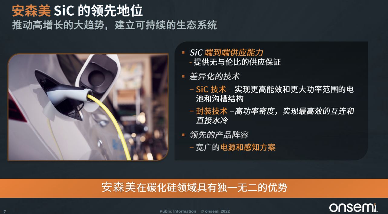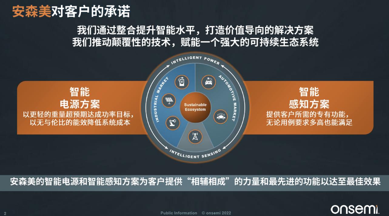 增長(zhǎng)的信心來(lái)自對(duì)于市場(chǎng)趨勢(shì)的預(yù)研和把握。半導(dǎo)體也是實(shí)現(xiàn)自動(dòng)駕駛和汽車功能電子化的關(guān)鍵賦能因素。智能電源技術(shù)就像是新能源汽車的心臟和肌肉,而智能感知就像是新能源汽車的眼睛和耳朵,幫助實(shí)現(xiàn)自動(dòng)駕駛的功能。而安森美在新能源汽車當(dāng)中潛在的產(chǎn)品含量和電子含量,將是傳統(tǒng)內(nèi)燃機(jī)車型的20倍左右。