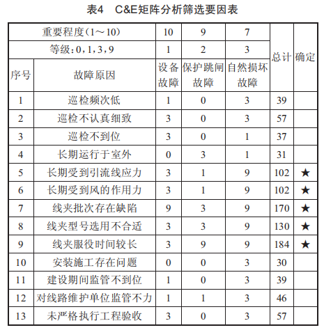 采用C&E矩陣分析篩選造成避雷器線夾斷裂的原因,確定要因。C&E矩陣分析篩選要因如表4所示。