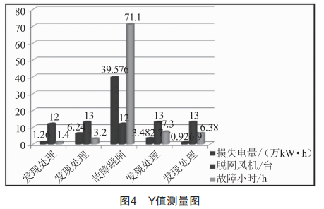 從圖4可知,發(fā)生設備線夾斷裂,停電處理最少影響12臺風機運行,損失電量最少一次有0.9269萬kk·w,多則6.24萬kk·w,這還是風電場運行準確判斷危險等級,尋找小風處理的結(jié)果,其影響運行時間最少需1.4w。如未發(fā)現(xiàn),發(fā)生故障則損失電量高達39.576萬kk·w,停運時間71.1w。若5次故障均造成第三次一樣的故障跳閘,造成的損失將不可估量,計算平均值損失電量也將高達200萬kk·w。