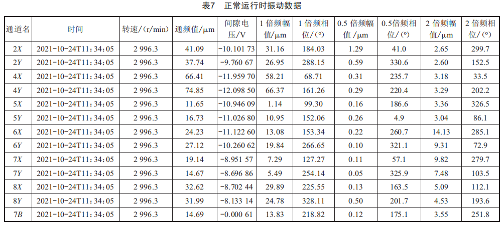 7X、7y振動隨轉(zhuǎn)速變化趨勢分別如圖4、圖5所示,可見振動波動主要發(fā)生在啟停機階段,存在兩個波峰。最大振動對應(yīng)轉(zhuǎn)速為1980r/min(二階臨界轉(zhuǎn)速),高于該轉(zhuǎn)速則振動立即下降,振動分量以1倍頻為主,是典型的轉(zhuǎn)子過臨界不平衡現(xiàn)象。1980r/min轉(zhuǎn)速下的振動數(shù)據(jù)如表8所示。