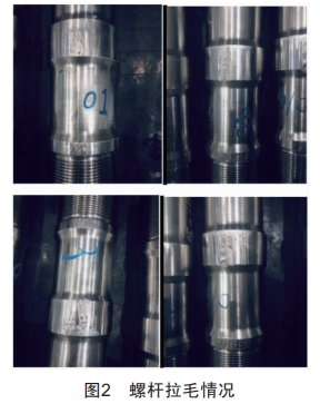 1號、2號、3號、13號、16號螺栓均存在咬死情況,螺桿取出困難。通過千斤頂加銅棒敲震取出,取出時前半段銷子不存在拉毛情況,后半段螺桿銷子拉毛,如圖2所示。