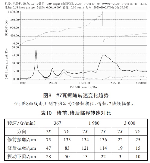#7瓦重點轉(zhuǎn)速下振動情況修前、修后對比如表10所示,可見C修大幅降低了過副臨界轉(zhuǎn)速367r/min時的峰值振動,整個啟機過程中#7瓦振動情況相比于修前都有所改善。