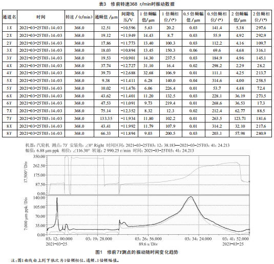2021年3月25日,對修前機組啟、停機及帶負(fù)荷運行的振動數(shù)據(jù)進行了采集,在3000r/min、1921r/min和368r/min轉(zhuǎn)速下,各瓦的振動數(shù)據(jù)如表1、表2、表3所示,其中7Y測點的振動隨時間變化趨勢如圖1所示。
