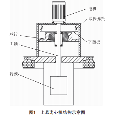 如圖1所示,上懸離心機轉(zhuǎn)子垂直支撐在帶有4個橡膠彈簧的懸臂柔性轉(zhuǎn)子上,球較位于轉(zhuǎn)子上部,通過球較和平衡板把轉(zhuǎn)子的橫向振動轉(zhuǎn)換為以軸向為樞軸的擺動,實現(xiàn)平衡板沿軸向擺動,通過固定在平衡板上的減振彈簧消耗轉(zhuǎn)子振動產(chǎn)生的能量來調(diào)控設(shè)備整體的振動狀態(tài)。