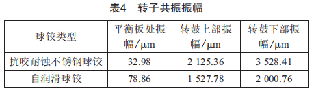 從表4所列三個位置的振幅可以看出,安裝抗咬耐蝕不銹鋼時,轉(zhuǎn)鼓的共振振幅遠大于安裝自潤滑球較時的振幅。
