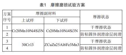 摩擦副材質(zhì)及潤滑方式如表1所示,試驗方案1和2為抗咬耐蝕不銹鋼Cr20Mn10Ni4si3N自配摩擦副,試驗方案3和4為馬氏體不銹鋼30Cr13與高力黃銅ZCuZn25A16Fe3Mn3組成的摩擦副。摩擦狀態(tài)分為兩種:)1)干摩擦狀態(tài):)2)防粘固體潤滑涂層潤滑狀態(tài)。防粘固體潤滑涂層為專用的干膜潤滑劑,牌號為FM-510,厚度為15um,僅制備在下試樣圓盤表面。