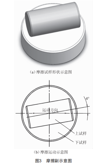 摩擦磨損試驗在微動摩擦磨損試驗機)sRV-V)上進行。摩擦試樣的形狀與運動方式如圖3所示。上試樣為圓柱型試樣,尺寸為小15mm×22mm:下試樣為盤試樣,尺寸為小25mm×7.8mm。上試樣圓柱面與下試樣平面形成摩擦副,接觸形式為圓柱面與平面形成的線接觸。下試樣固定不動,上試樣往復(fù)運動,運動方向與上試樣軸向的夾角為4°。微動摩擦磨損試驗在室溫下進行,具體參數(shù)為往復(fù)行程0.5mm、載荷50N、頻率10Hz、磨損時間30min。