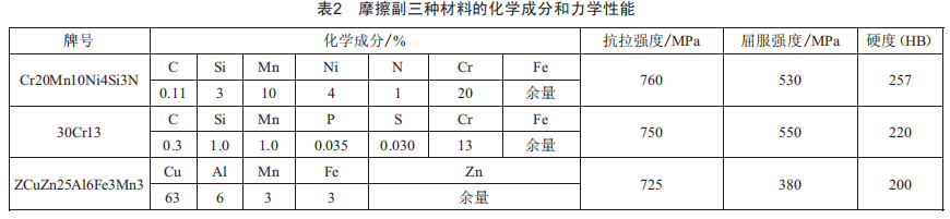 摩擦副三種材料的化學(xué)成分和力學(xué)性能如表2所示。