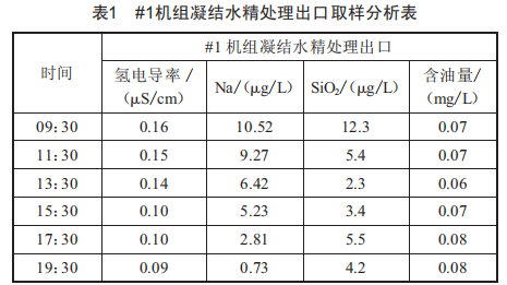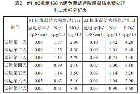 表2是#1、#2機組168h滿負(fù)荷試運階段凝結(jié)水精處理出口水樣分析表。