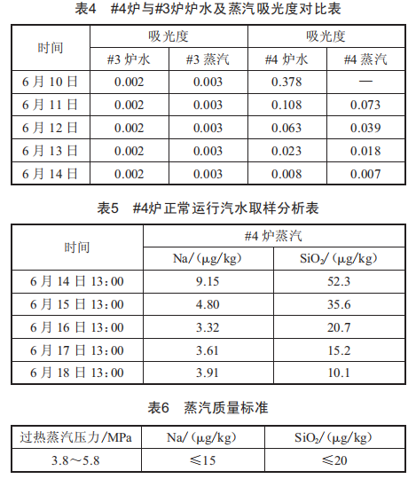 將6月11日至6月14日#4爐水及蒸汽樣外送分析含油量,結(jié)果顯示#4爐水含油量從0.9mg/L下降至0.28mg/L,#4爐蒸汽含油量從0.7mg/L下降至0.17mg/L。對比表4可以看出,隨著熱態(tài)清洗的進行,#4爐水及蒸汽的吸光度明顯下降,雖然無法定量判斷水中油的含量,但是可以從趨勢中發(fā)現(xiàn)含油量的減少。故通過分光光度法對吸光度的大小進行對比,可以初步判斷沖洗效果,以便指導(dǎo)何時進入下一階段的沖洗。