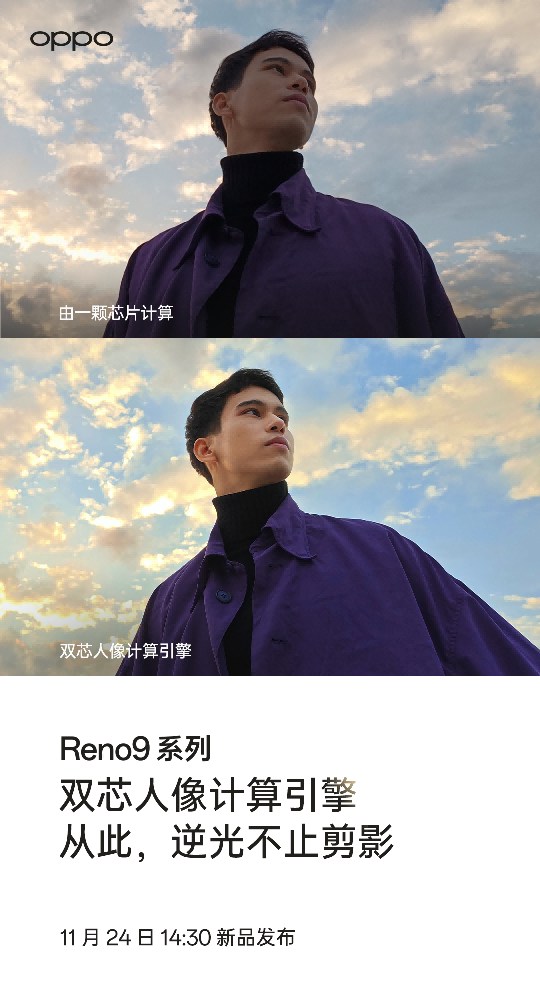 雙芯人像,迎光而拍。更多OPPO Reno9系列新品信息,敬請期待11月24日14:30準時召開的新品發(fā)布會。