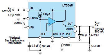 目前,使用LDO作為模擬器件的模擬供電引腳輸入是最常見的做法。ADI的下一代LDO穩(wěn)壓器具有大約1μV rms的超低噪聲,可以提供200mA至3A的電流。電路和規(guī)格參數(shù)如圖2和圖3所示。