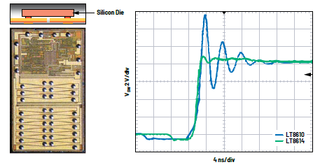 圖6.與傳統(tǒng)綁定技術(shù)(LT8610)相比較的銅柱倒裝芯片封裝及其性能(LT8614)