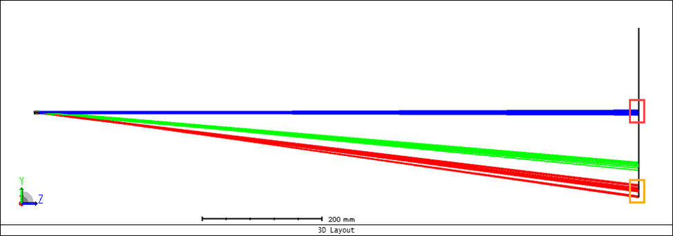 目前,我們可以將每個(gè)視場(chǎng)點(diǎn)的發(fā)射都看作為單個(gè)二極管的發(fā)射,其光線將被投影到所觀察的場(chǎng)景中。在這個(gè)階段,由于光束將在遠(yuǎn)場(chǎng)中被觀察到,并且這個(gè)系統(tǒng)主要受幾何像差的影響,因此我們可以將基于幾何光線的結(jié)果作為觀察場(chǎng)景中的光斑性能的良好指標(biāo)。然后,幾何圖像分析(Geometric Image Analysis)工具可用于可視化距離照明模塊大約一米遠(yuǎn)的光斑情況: