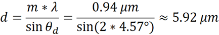所允許的最小衍射角 θd 是視場(chǎng)水平半視場(chǎng)的兩倍。當(dāng) fc = 10mm,物體高度為 0.8mm 時(shí),零階的半視場(chǎng) θhoriz, 為4.57?,這可以幫助我們確定光柵刻線之間所需的距離 d(以微米為單位):