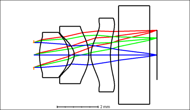 由于這種設(shè)計(jì)旨在實(shí)現(xiàn)緊湊的尺寸,成像系統(tǒng)必須平衡該標(biāo)準(zhǔn)與它對(duì)視場(chǎng)相關(guān)像差的影響,如畸變和場(chǎng)曲。該設(shè)計(jì)采用了類似于 Cooke 三片式透鏡的結(jié)構(gòu),即在兩個(gè)低折射率的正透鏡之間有一個(gè)高折射率的負(fù)透鏡。所有元件上都具有非球面系數(shù),允許通過(guò)第一個(gè)透鏡校正球差,而第三個(gè)透鏡可作為場(chǎng)鏡,以改善畸變和場(chǎng)曲的性能。此外,模型中最后還包含一個(gè)平板玻璃,該平板玻璃可作為覆蓋接收器模塊圖像傳感器的蓋板。