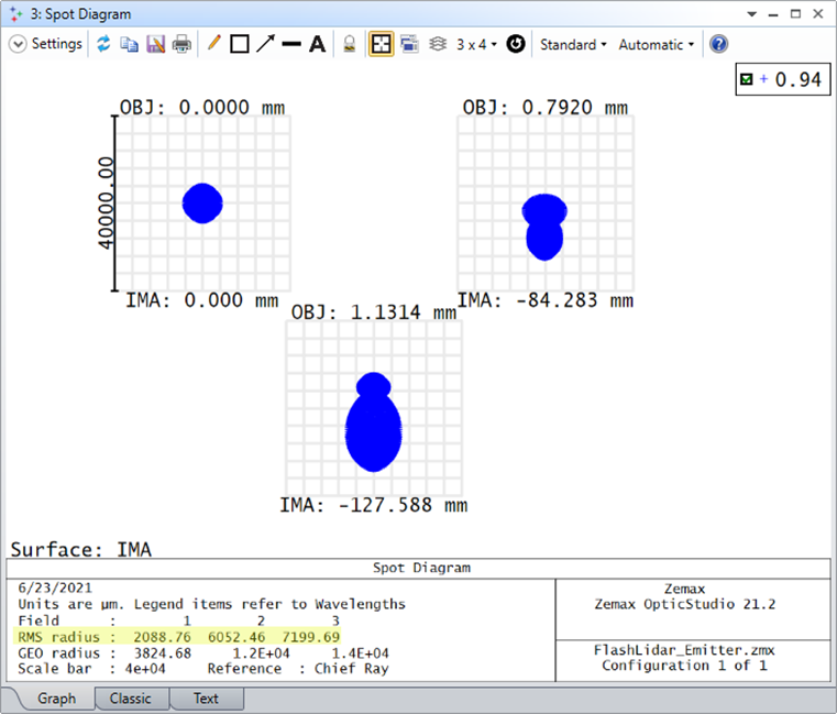 在當(dāng)前階段,我們將把實(shí)例文件保存為 “FlashLidar_Emitter_DiffGrat.ZAR”。雖然這是二極管陣列將涵蓋的整體區(qū)域的輸出,但實(shí)際的照明模塊將使用一系列二極管作為點(diǎn)光源,因此照明圖案將成為一系列的點(diǎn)。GIA 檢查的目的是確保當(dāng)我們?cè)诜切蛄心J街懈苯拥囟x光源時(shí),不同衍射級(jí)次之間的光點(diǎn)不會(huì)重疊。