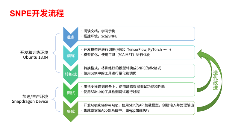 而我們繼續(xù)在思考,僅僅有硬件框架還不夠,如何在這樣一套硬件框架上使客戶能高效低研發(fā)成本的引入AI能力,從單純連接類硬件向智能化硬件升級(jí)?因此,美格智能將研發(fā)繼續(xù)向前一步,物聯(lián)網(wǎng)定制化解決方案基于高通神經(jīng)網(wǎng)絡(luò)處理引擎(SNPE),支持Caffe、TensorFlow、TFLite、ONNX、PyTorch和Caffe2等模型、API和可嵌入App的執(zhí)行庫(kù),AI研發(fā)人員可以選擇使用自己熟悉的框架設(shè)計(jì)和訓(xùn)練網(wǎng)絡(luò),快捷高效的完成AI對(duì)于各類終端產(chǎn)品的技術(shù)賦能。開發(fā)流程如下:
