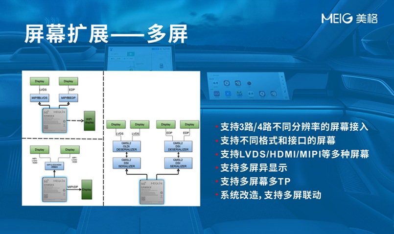 以AI能力覆蓋0.2T到30T的智能模組為基礎(chǔ),為助力客戶在不同模組基礎(chǔ)上快速開發(fā)出一系列智能化設(shè)備,美格智能將研發(fā)繼續(xù)向前一步,在模組基礎(chǔ)上提供針對(duì)行業(yè)及各類外接感知設(shè)備的完整解決方案。以最常見的感知硬件攝像頭和屏幕來講,攝像頭如同人的眼睛,負(fù)責(zé)信息錄入,而屏幕如同嘴巴,負(fù)責(zé)輸出信息,因此美格智能自研了一套多屏多攝像頭架構(gòu)圖,為設(shè)備的視覺能力搭建最基礎(chǔ)的硬件框架,便于各類客戶在此硬件框架上直接開展終端產(chǎn)品和應(yīng)用開發(fā)。