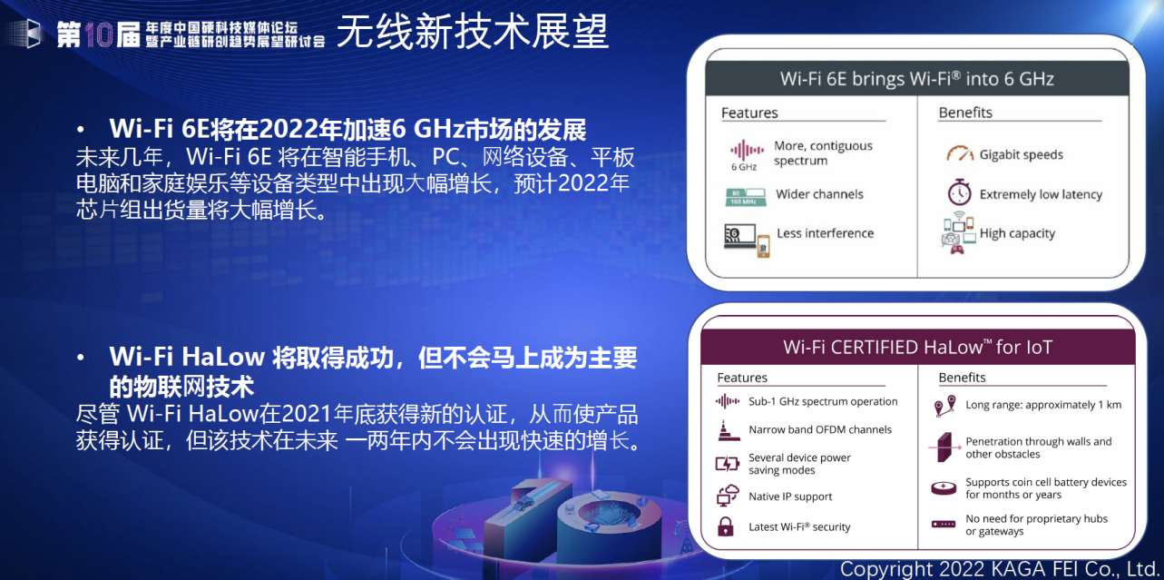 針對無線連接技術(shù)的普及,當前具有明確前景的是Wi-Fi 6E。據(jù)杜復旦介紹,未來幾年Wi-Fi 6E 將在智能手機、PC等消費電子設備中出現(xiàn)?幅增長,預計2022年芯?組出貨量將大幅增長。而Wi-Fi HaLow雖然已經(jīng)在2021年底獲得了新的認證,但其技術(shù)普及在未來兩年尚不具備成熟市場條件。