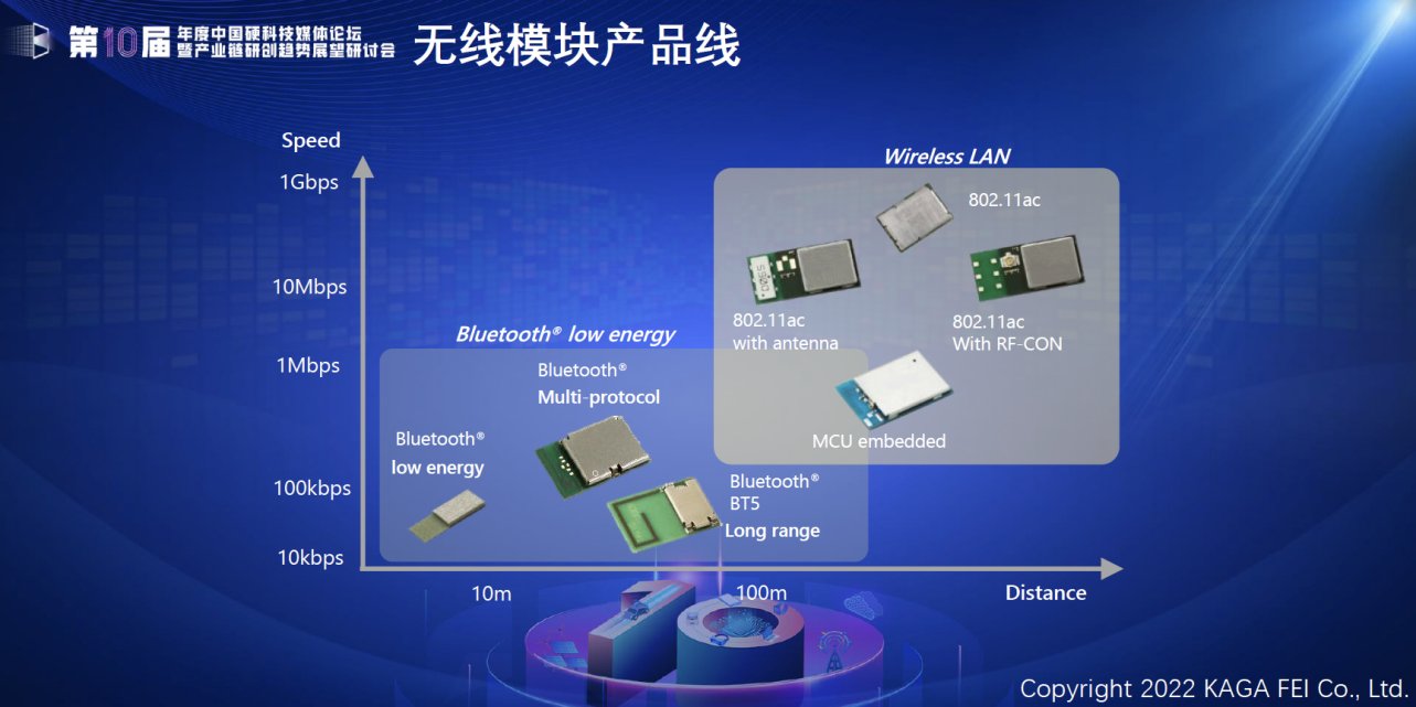 針對無線連接市場,加賀富儀艾電子的產(chǎn)品布局在低功耗藍牙和WLAN。藍牙模塊有世界上最小尺寸的EYSHSNZWZ,重量僅1g左右;也有能夠?qū)崿F(xiàn)1km以上超遠距離EYSKDNZWB。小尺寸的模塊的典型應用場景例如筷子、電子煙等外型受限終端,而長距離的模塊則可用于路燈等應用場景,客戶可根據(jù)不同需求選擇合適的藍牙模塊。WLAN模塊有天線內(nèi)置型的WYSAGVDXG,也有MCU嵌入型的WYSACVLAY-XZ,為客戶提供WLAN + 藍牙Combo模塊。