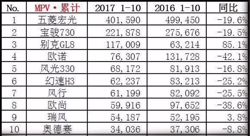 看完這個(gè)表格我們會(huì)發(fā)現(xiàn),在今年前十個(gè)月的MPV銷量排行中,位列前十而又同比上升的品牌只有兩個(gè),一個(gè)是合資品牌的常青樹(shù)別克GL8,同比增幅高達(dá)85.1%;另外一個(gè)就是江淮瑞風(fēng),增幅為3.8%。