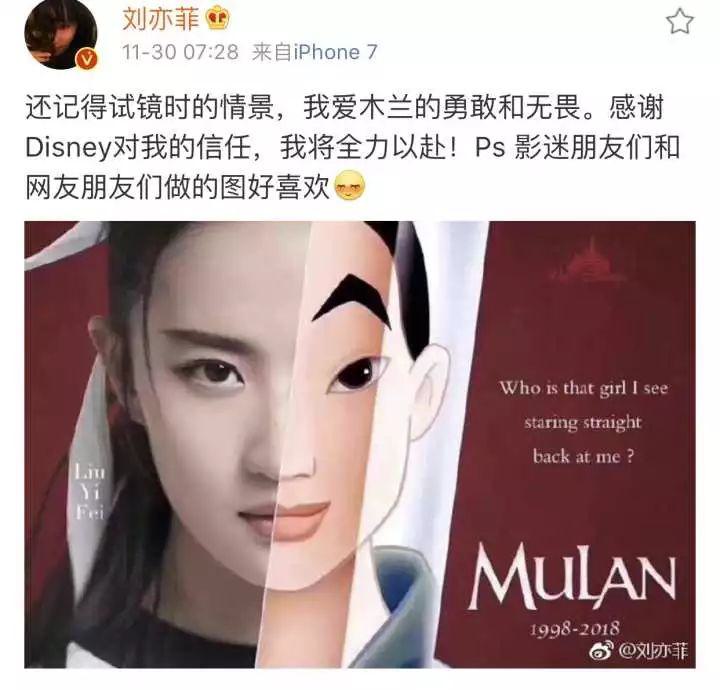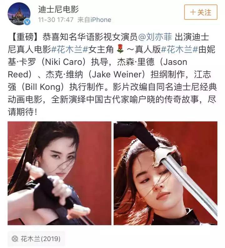 前天迪士尼官方公布了真人版《花木蘭》的女主角,居然是天仙劉亦菲,粉絲激動(dòng)得都快瘋了。很多歐美二線(xiàn)演員做夢(mèng)都想拿到這個(gè)角色,國(guó)內(nèi)一線(xiàn)女星同樣垂涎《花木蘭》女主,候選人有接近1000人,來(lái)自5大洲,都被劉亦菲PK掉了。