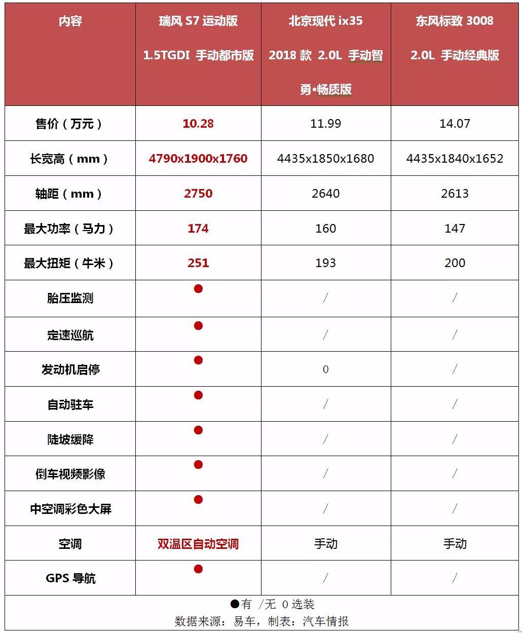 從下方表格可以看出,無論是決定乘坐舒適度的長寬高以及軸距尺寸,還是決定駕駛性能的發(fā)動機最大功率、最大馬力,亦或是胎壓監(jiān)測、定速巡航、自動駐車、陡坡緩降等日常實用配置,瑞風S7運動版都要比ix35和東風標致3008優(yōu)秀不少。再加上,同樣是入門級車型,瑞風S7運動版的價格相對另外兩款更加實惠,性價比更突顯。誠然,正是這樣有說服力的數(shù)字對比更直截了當?shù)娘@示出其在細分市場的競爭力。
