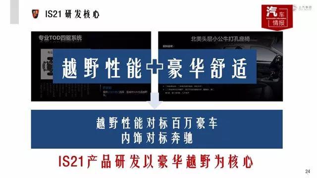 最令人興奮的是,PPT 中非常鮮明地標(biāo)注了兩個(gè)關(guān)鍵信息:一是越野性能對(duì)標(biāo)百萬(wàn)豪車,一是內(nèi)飾對(duì)標(biāo)奔馳。而產(chǎn)品的定位則用八個(gè)字進(jìn)行了概括“越野性能+豪華舒適”。上汽榮威這款代號(hào)為IS21的神秘產(chǎn)品到底有多豪華舒適?越野性能又到底有多強(qiáng)?根據(jù)PPT上的信息,讓小編來(lái)“解讀”一二。