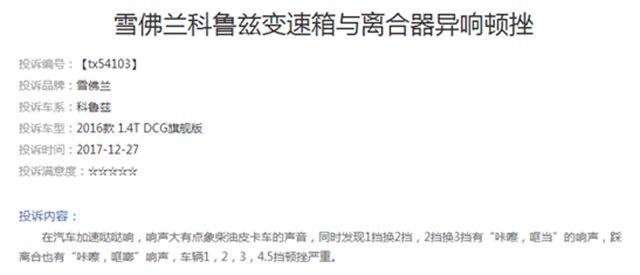車質(zhì)網(wǎng)的投訴顯示,雪佛蘭科魯茲的投訴量突破了一千條,主要投訴的典型問題包括變速箱異響、頓挫,轉(zhuǎn)向失靈,離合器異響等。其實往前追溯到2015年、2016年,雪佛蘭科魯茲的投訴就常年占據(jù)著投訴榜單的前十名。可見,科魯茲的問題已經(jīng)出現(xiàn)好幾年了,卻仍未得到雪佛蘭方面的回復(fù)。