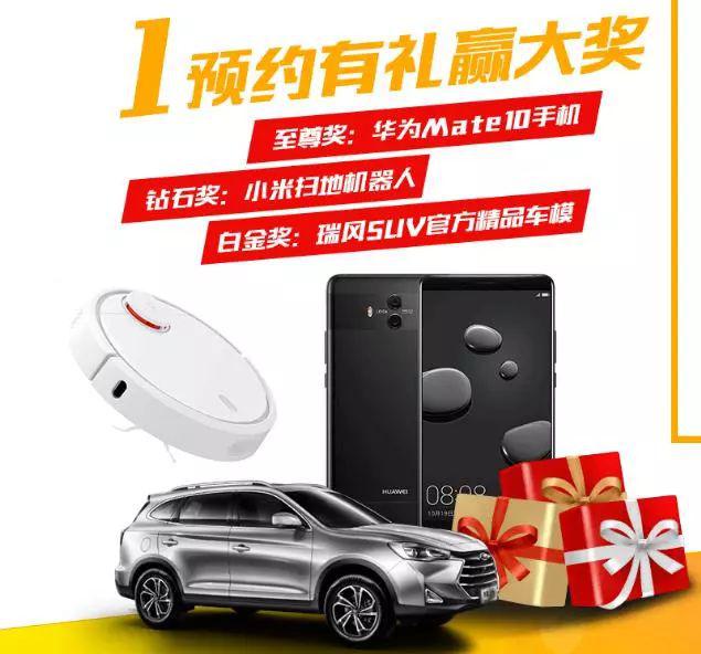 通過H5界面參與活動,消費者不但有機會獲取華為Mate 10手機、小米掃地機器人、瑞風SUV官方精品車模等豪獎,更有機會搶到最高價值10000元的購車紅包。不論你買不買車,只要參與活動就有可能獲得重磅獎品!