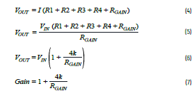 LT5400電阻網(wǎng)絡(luò)用于設(shè)置放大器的增益。增益計算如公式1至公式3所示。