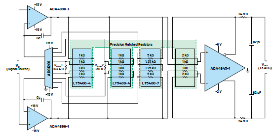 本文介紹了使用ADA4898-1放大器、ADG1209多路復(fù)用器和LT5400精密匹配電阻構(gòu)建分立式寬帶寬PGIA的設(shè)計。該設(shè)計在幾十毫伏到10V的單端/差分信號輸入范圍內(nèi),同時驅(qū)動16位15MSPS采樣率的 ADAQ23875信號鏈μModule的解決方案可實現(xiàn)高精度測量。與使用市面上可用的單片式PGIA相比,完整的信號鏈可提供更好的整體精密性能。這款寬帶寬信號鏈專為特定客戶群定制,旨在構(gòu)建用于自動化測試設(shè)備、電源監(jiān)控和分析儀的測試儀表。