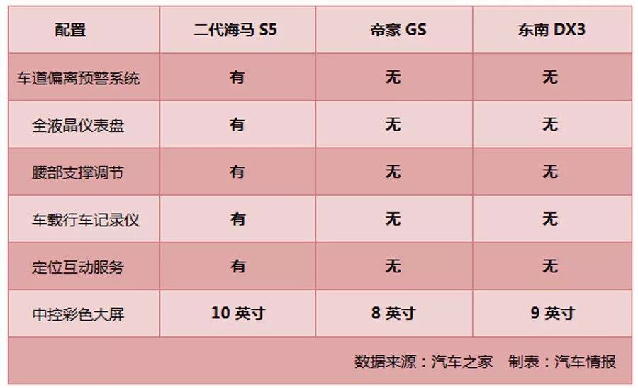 不但如此,與帝豪GS、東南DX3相比,在配置方面二代海馬S5的優(yōu)勢也十分明顯,比如車道偏離預(yù)警系統(tǒng)、全液晶儀表盤、腰部支撐調(diào)節(jié)、車載行車記錄儀、10英寸中控彩色大屏等配置,都提供了更好的駕駛感受。
