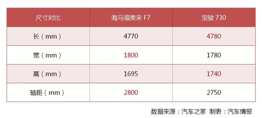 通過圖表中的數(shù)據(jù)顯示,福美來F7和寶駿730在長度和寬度方面幾乎沒有太大差距,但是高度方面,寶駿730略有優(yōu)勢,這也是為什么寶駿看起來更像“面包車”的原因。至于軸距,福美來F7則要強于寶駿730。