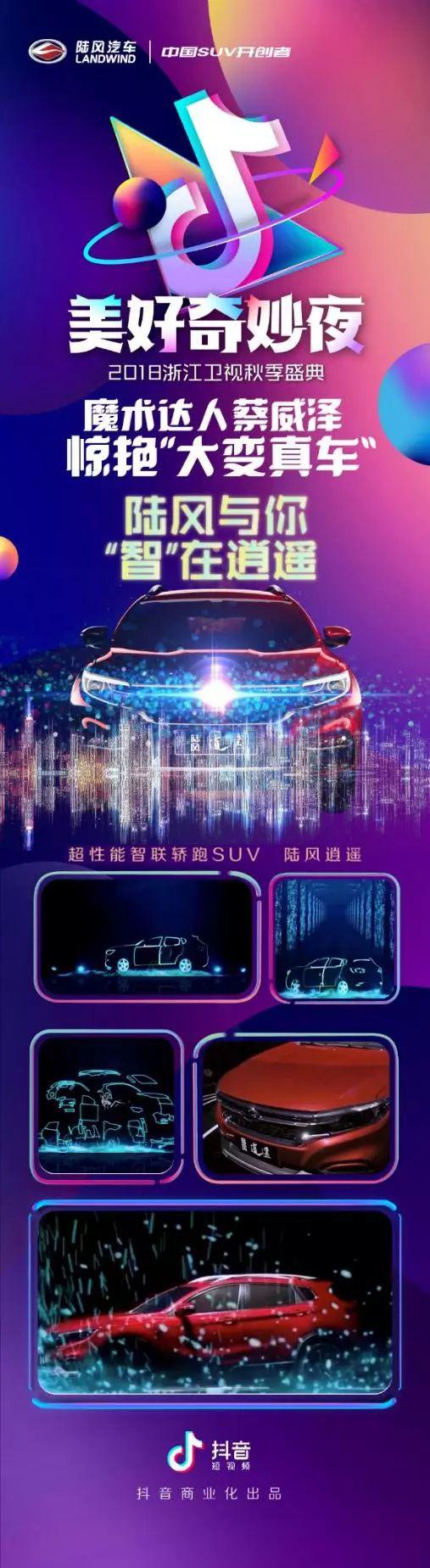 10月19日,我還記得那是個周五,下班后窩在沙發(fā)里百無聊賴的準(zhǔn)備看會電視打發(fā)時間,當(dāng)換到浙江衛(wèi)視時,卻被一場名為“抖音美好奇妙夜2018浙江衛(wèi)視秋季盛典”的晚會給吸引了。不為別的,起初就是因?yàn)椤岸兑簟倍?。但在魔術(shù)表演環(huán)節(jié),一輛陸風(fēng)逍遙突然憑空出現(xiàn)在舞臺中心,這讓不少人都著實(shí)有些驚訝,疑惑到底是怎么做到的?再搭配上炫麗的舞臺效果,讓陸風(fēng)逍遙再次成為了全場矚目的焦點(diǎn)。就在那一刻,它的營銷成功了。