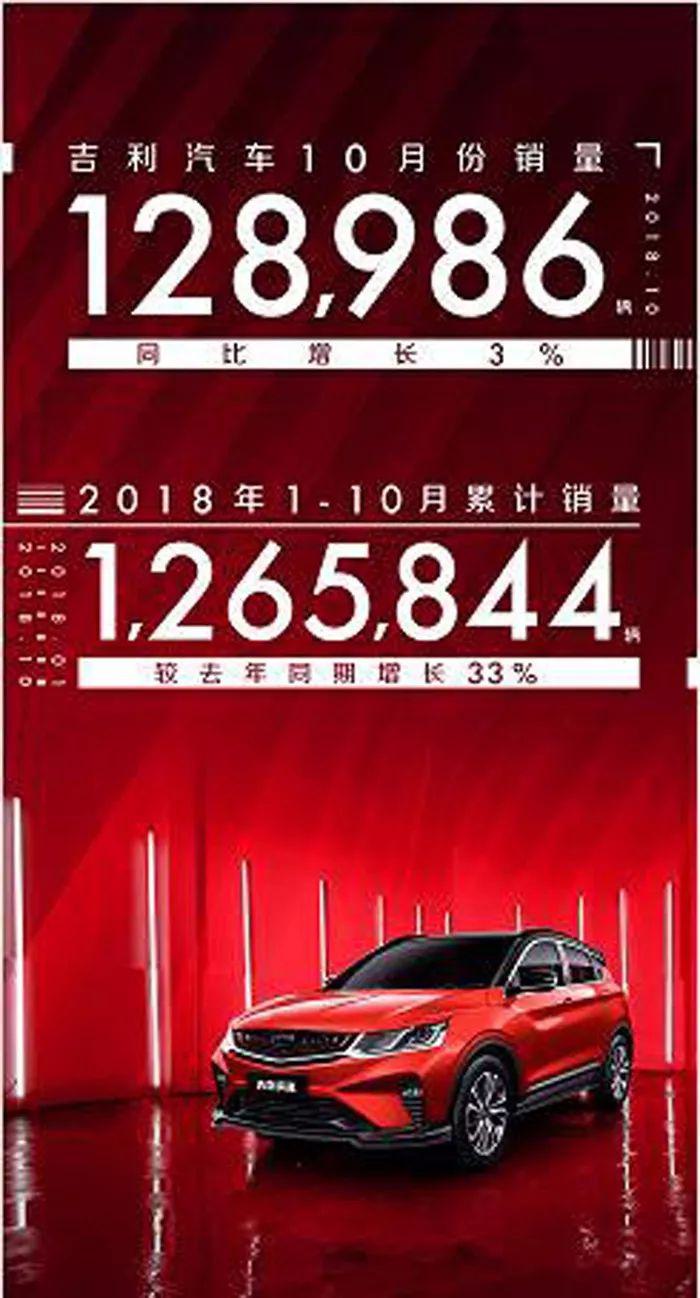 回顧今年的車市,雖然整體并不景氣。但對(duì)于吉利而言,卻并未受到大環(huán)境的影響。今年1-10月份,吉利汽車?yán)塾?jì)銷售新車1265844臺(tái),同比增長(zhǎng)百分之33%。而在剛剛過去的10月份,吉利汽車共售出新車128986臺(tái),同比增長(zhǎng)3%,旗下的博越、帝豪GS、全新帝豪等多款車型月銷量均在萬臺(tái)以上。