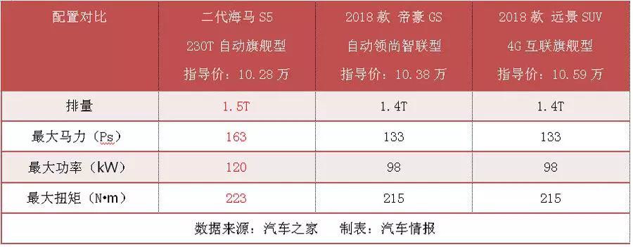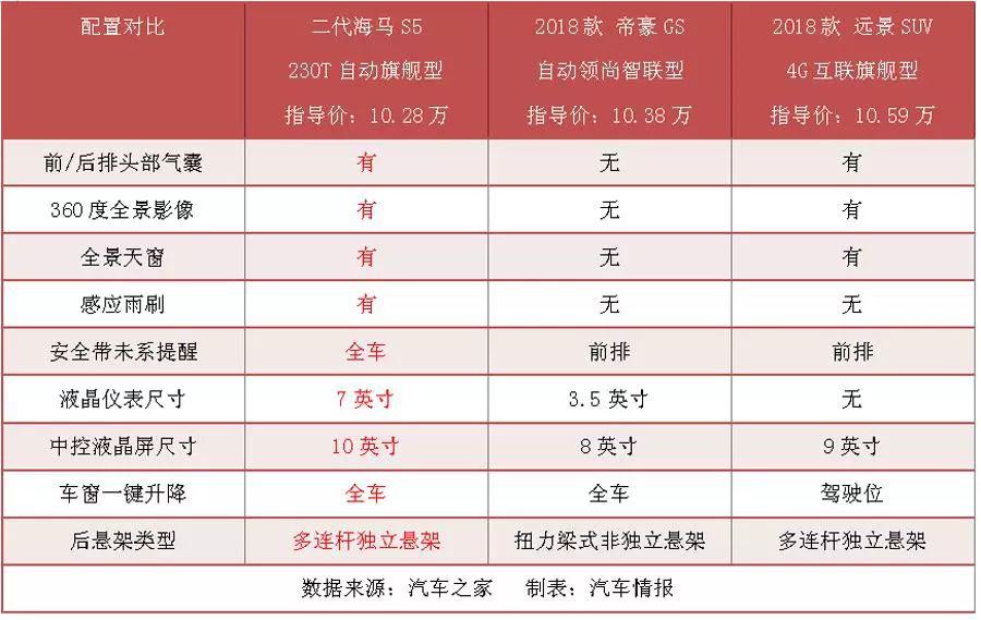 在三輛車的配置比拼中,我們選擇了二代海馬S5的次頂配、2018款帝豪GS的中高配以及2018款遠(yuǎn)景SUV頂配三款售價(jià)相近的車型。通過(guò)配置對(duì)比不難發(fā)現(xiàn),雖然二代海馬S5的指導(dǎo)價(jià)格最低,但是配置與2018款帝豪GS、2018款遠(yuǎn)景SUV相比卻是有過(guò)之而無(wú)不及,確實(shí)是誠(chéng)意滿滿。