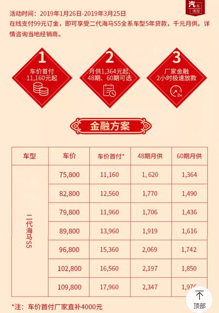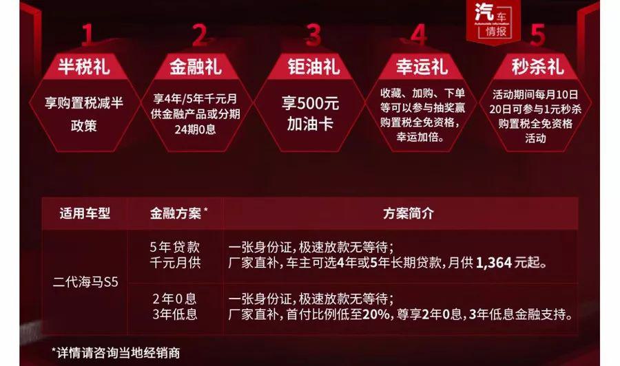 風口過處,遍地硝煙。優(yōu)勝劣汰的叢林法則,在競爭激烈的車市中更顯殘酷。不出意料,2月11日,年后上班第一天,一汽-大眾率先出牌,打響了汽車下鄉(xiāng)第一槍。歐尚汽車和海馬汽車則緊隨其后,代表中國品牌加入這場攻堅戰(zhàn)。而隨后,仍有包括北汽在內(nèi)的諸多車企躍躍欲試,不想錯過這趟飛速駛來的高速列車。不過,讓人疑惑的是,諸多車企中,汽車情報新媒體為何要重點把海馬汽車挑出來敘述?實際上,除了海馬汽車提出的競爭力不俗的下鄉(xiāng)政策外,其獨一無二的主場優(yōu)勢更具備研究價值。先來看海馬汽車推出的“購置稅減半”優(yōu)惠活動,按照目前10%的購置稅率來計算,購買二代海馬S5、海馬S5紀念版以及福美來F7這三款車型,最高可減免5990元,幾乎相當于一臺iPhone XR的價格。此外,還有包括鉅油禮、幸運禮以及秒殺禮在內(nèi)的多項優(yōu)惠,如下圖所示,每一項都夠誠意。