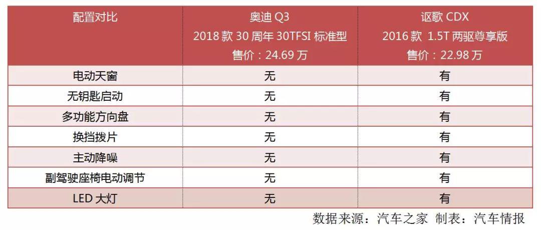 而在配置層面,雙方的側(cè)重點(diǎn)也不同,本次對比就選用了二者的最低配車型。分別是售價(jià)22.98萬的廣汽Acura CDX 2016款1.5T兩驅(qū)暢享版,24.69萬的奧迪Q3的2018款30周年 30TFSI標(biāo)準(zhǔn)型。