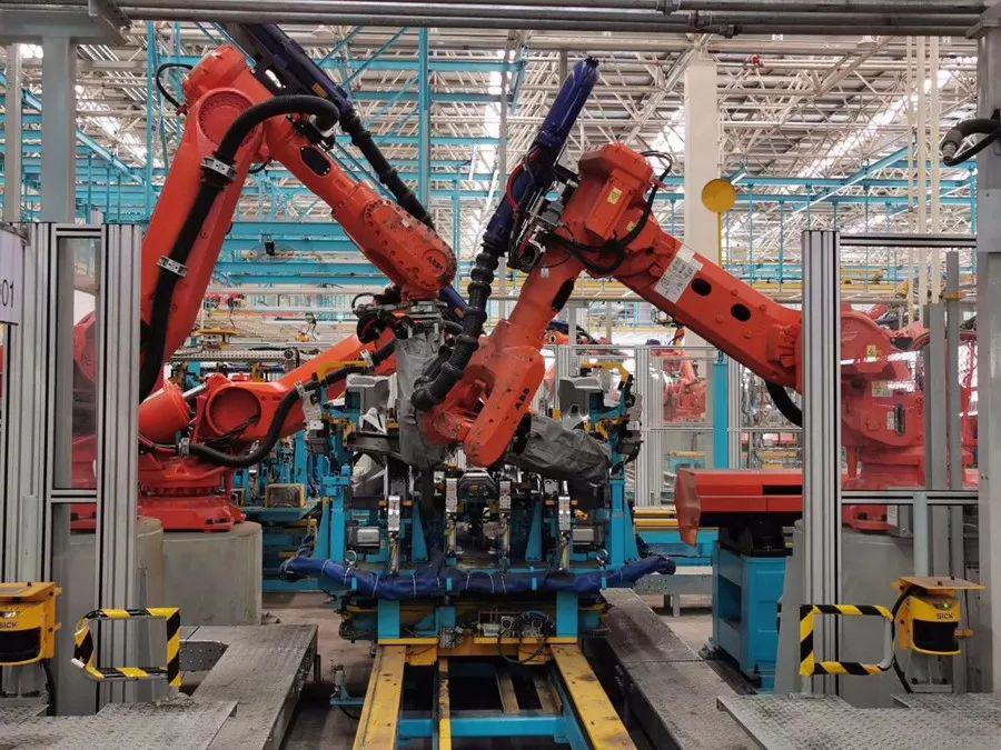 作為一臺車裝配起步的焊裝車間,放眼望去一水的全球頂級的各種高自動化設備。250臺瑞典ABB機器人、196把德國尼瑪克機器人焊鉗、184臺博世中頻自適應焊機,整體自動化率達85%,全自動化電氣化管理,能夠根據(jù)不同工況自動調節(jié)焊接參數(shù),并對車間內操作的約2600個焊點實時在線質量和過程的監(jiān)控,這可真是從源頭就能確保車輛的高品質生產(chǎn)。