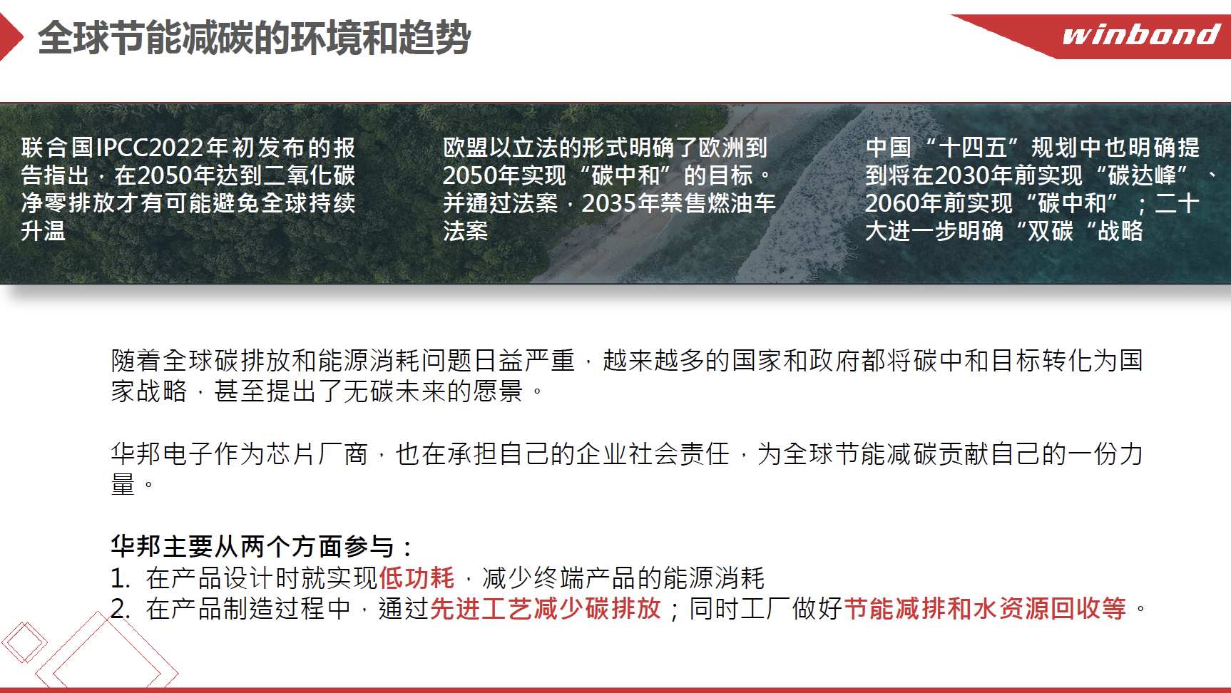 綠色發(fā)展已成全球共識(shí),半導(dǎo)體廠商即是節(jié)能減排的技術(shù)賦能者,自身也是節(jié)能減排的實(shí)踐者和責(zé)任人。全球各大半導(dǎo)體廠商紛紛制定了自己的碳減排目標(biāo)。近日領(lǐng)先的存儲(chǔ)芯片廠商華邦電子(Winbond)也專門召開了媒體會(huì),華邦電子大陸區(qū)產(chǎn)品營(yíng)銷處處長(zhǎng)朱迪先生和記者分享了華邦在節(jié)能減排和ESG方面的成績(jī)。