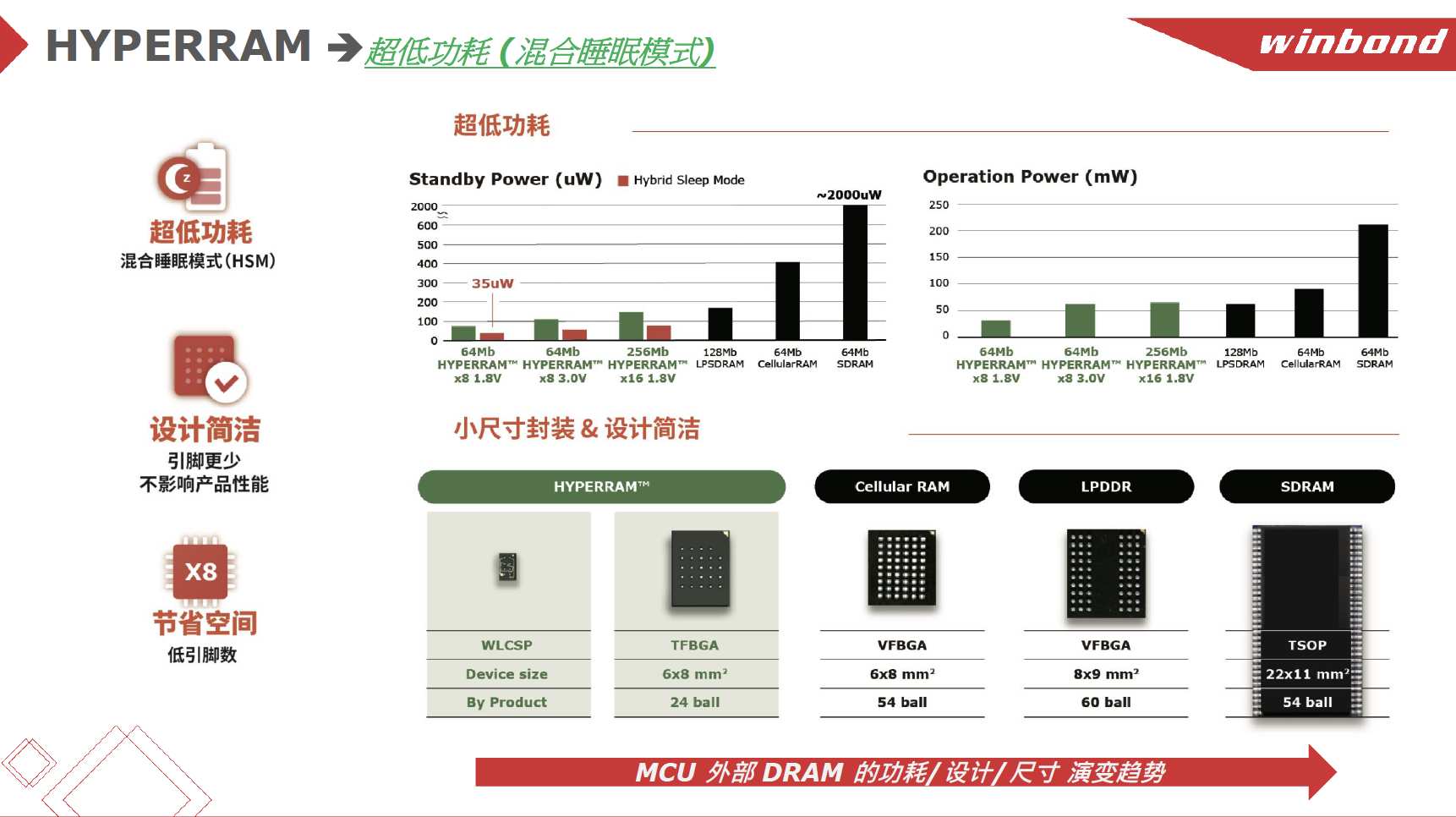 除了GP-BoostDRAM外,針對(duì)低功耗的DRAM市場(chǎng)需求,華邦還推出了超低功耗特性的HYPERRAM系列。該系列的運(yùn)行功耗遠(yuǎn)低于同容量的CellularRAM和SDRAM,同時(shí)通過(guò)特有的混合睡眠模式(Hybrid Sleep Mode),HYPERRAM功耗可進(jìn)一步降低。