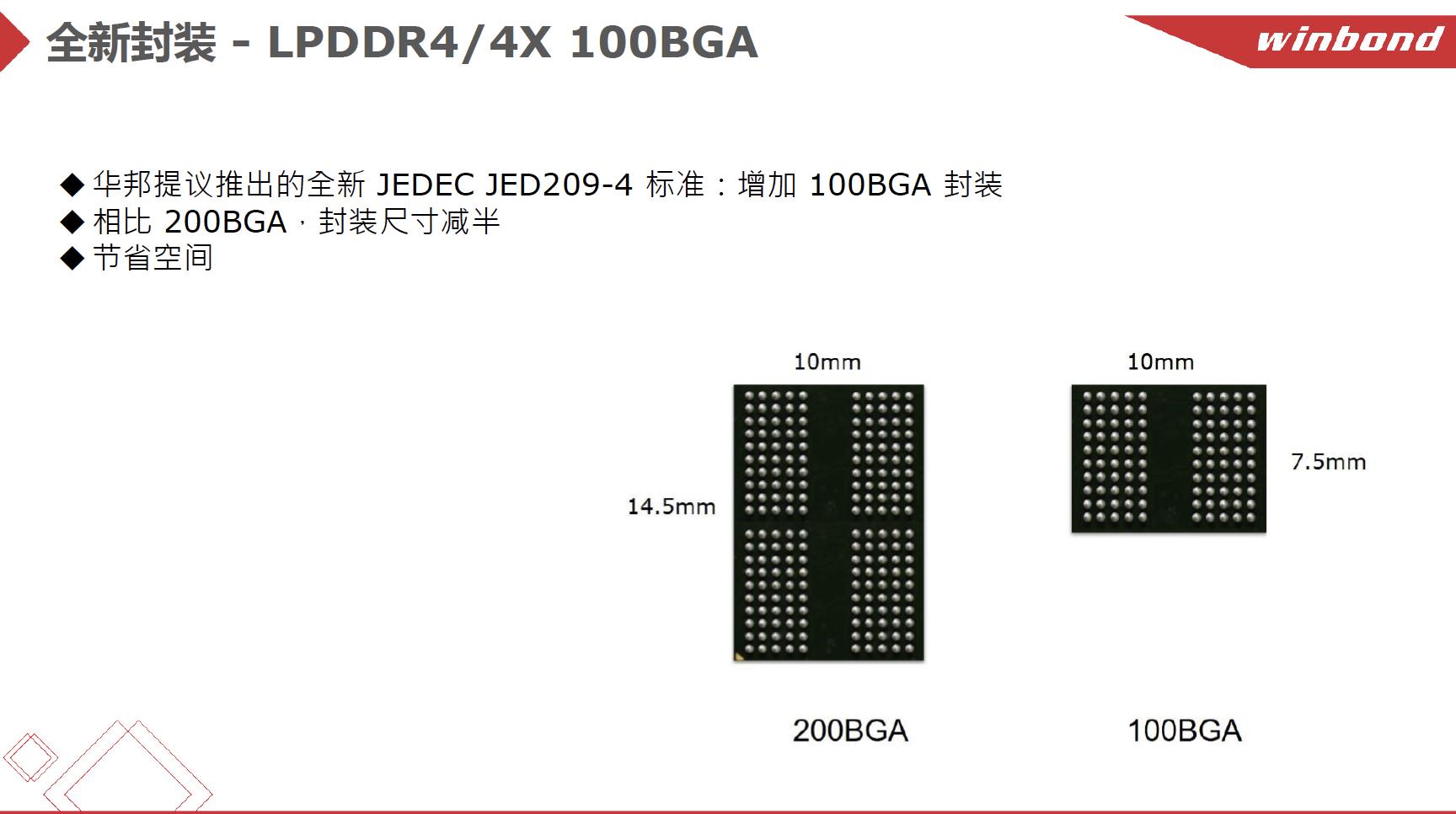 除了產(chǎn)品本身的低功耗特性之外,產(chǎn)品封裝上所用的化學(xué)原材料用量也與能源消耗息息相關(guān)。每一顆芯片的外部都有厚厚的一層塑膠保護(hù)層,如果把封裝做小就會(huì)減少化學(xué)物品的消耗。華邦最新推出的100BGA LPDDR4/4X就是一個(gè)在封裝層面降低消耗的經(jīng)典產(chǎn)品。華邦曾向JEDEC標(biāo)準(zhǔn)組織提議在JED209-4標(biāo)準(zhǔn)里增加對(duì)100BGA封裝的規(guī)定。相對(duì)于傳統(tǒng)的200BGA,100BGA的封裝體積縮小了一半左右,節(jié)約了整體材料成本。這種縮小的封裝也可以減少器件在PCB的占用空間,幫助客戶同時(shí)降低了成本和能源消耗。